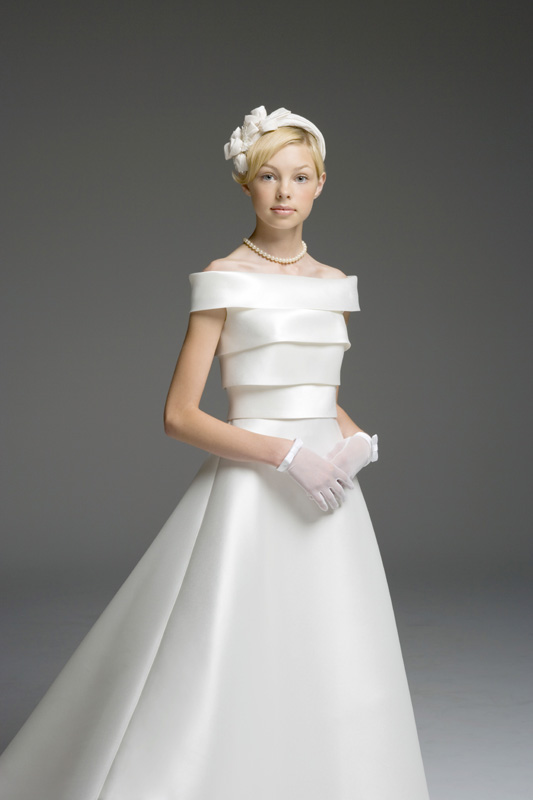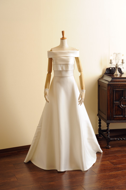 ゼクシィでも問合せの多いクラシコ。クラシカルな雰囲気でモダンにデザインされた胸元が印象的で、さりげなく二の腕をカバーしてくれるのが魅力的。シルク感のあるミカドなのでアレンジによってどんな会場でも可能です。