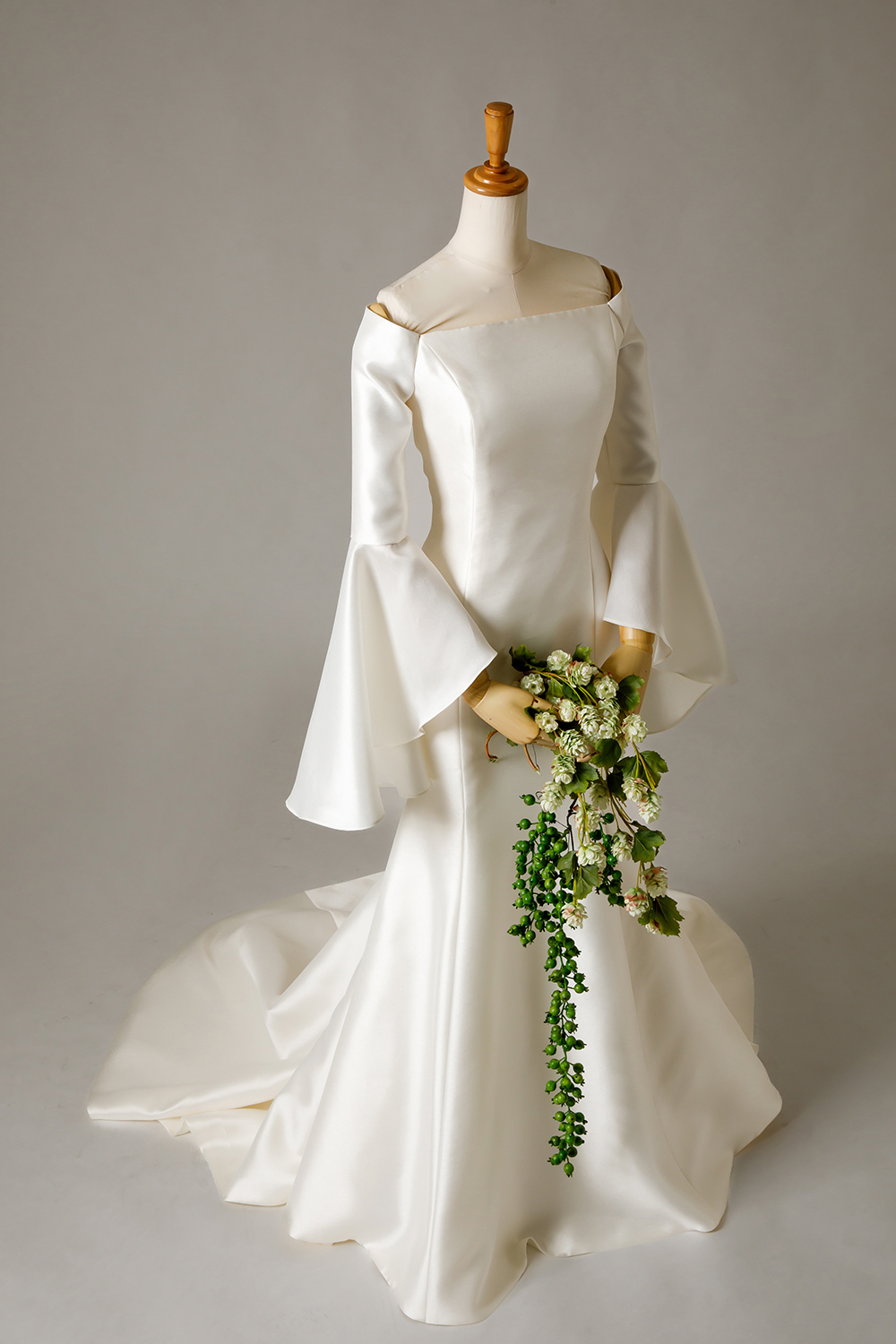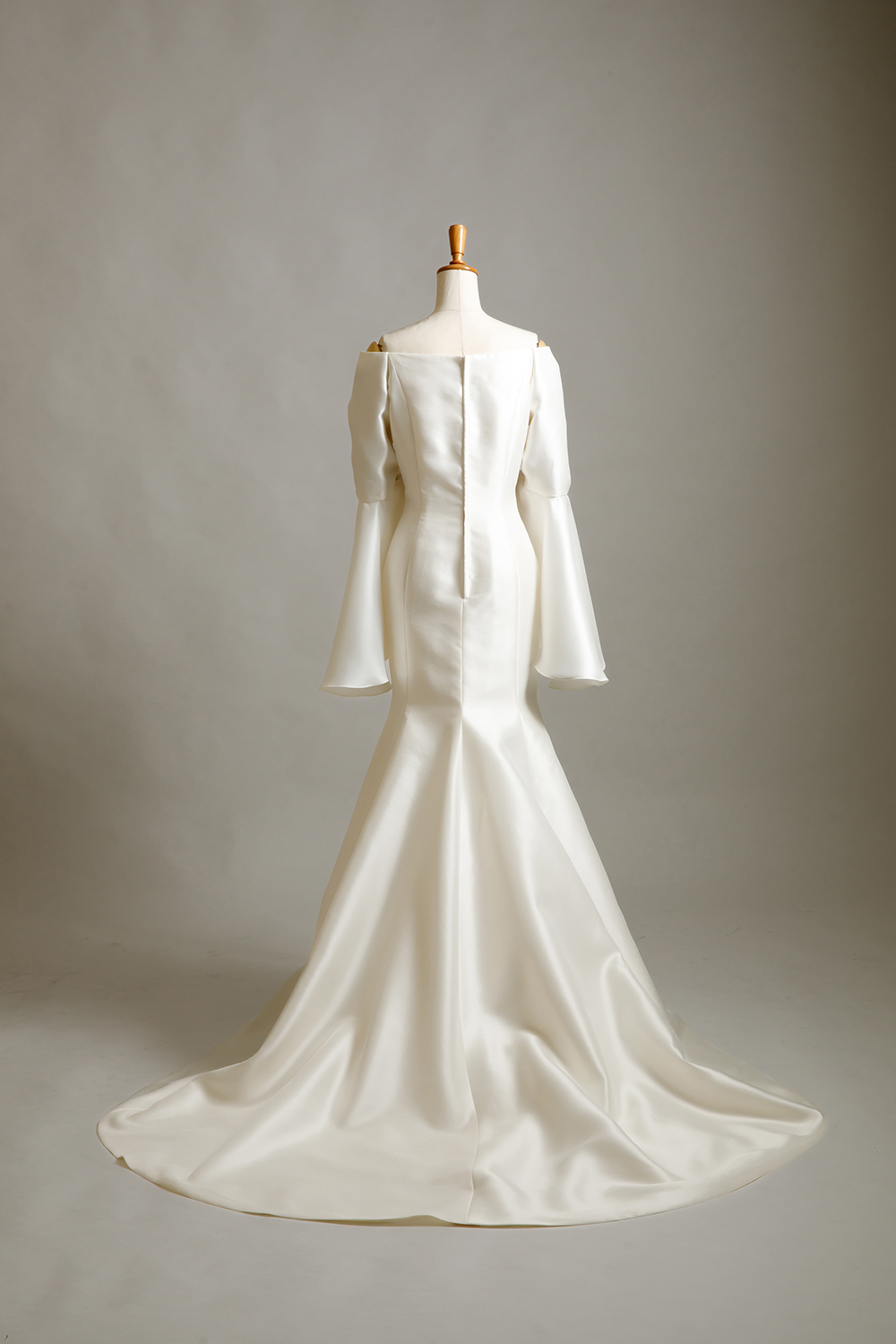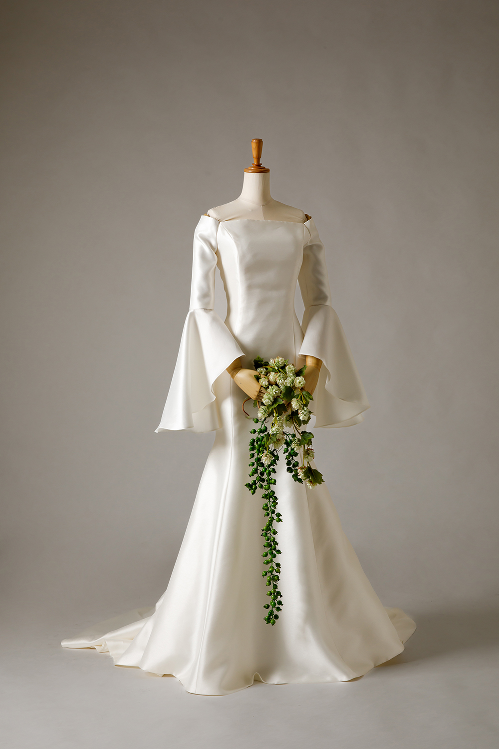 ミカドシルクのマーメイドに、長袖。パコダスリーブを用いたデザイン。二の腕が気になるけど、マーメイドが着たい花嫁様へ。