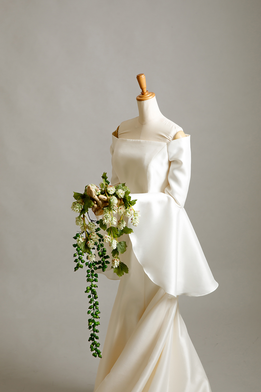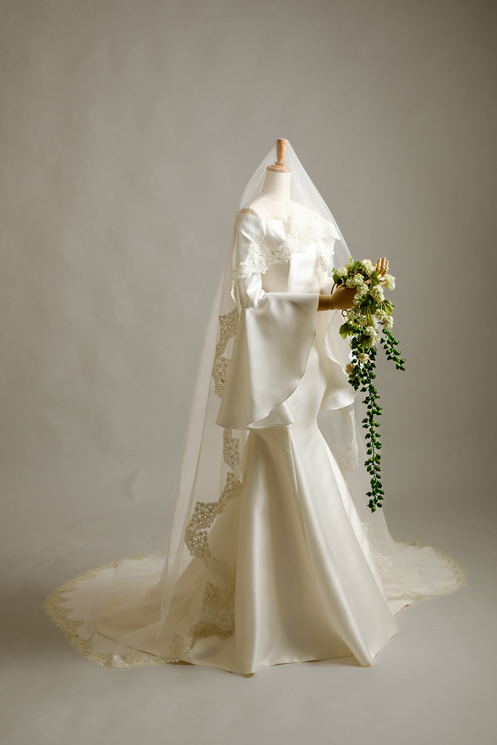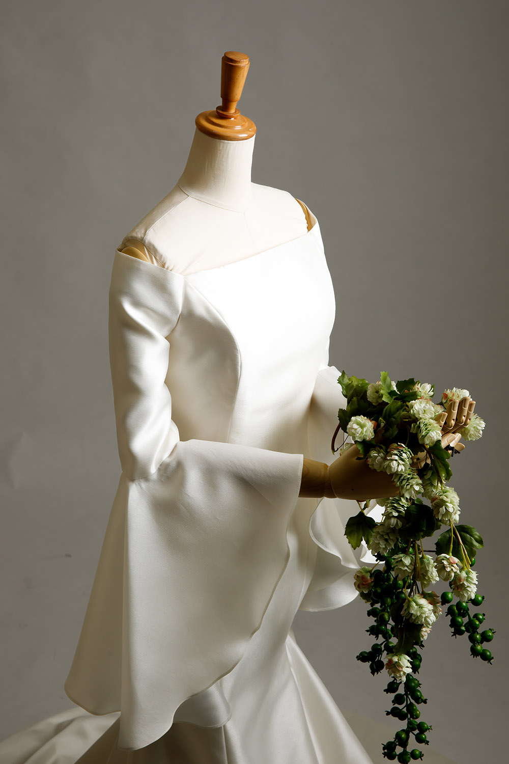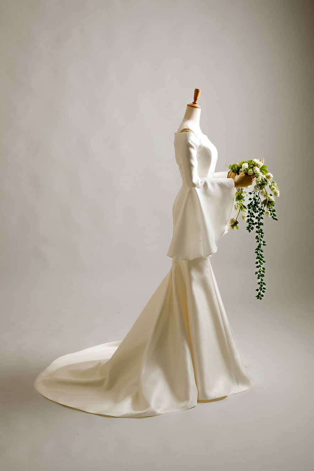 ミカドシルクのマーメイドに、長袖。パコダスリーブを用いたデザイン。二の腕が気になるけど、マーメイドが着たい花嫁様へ。