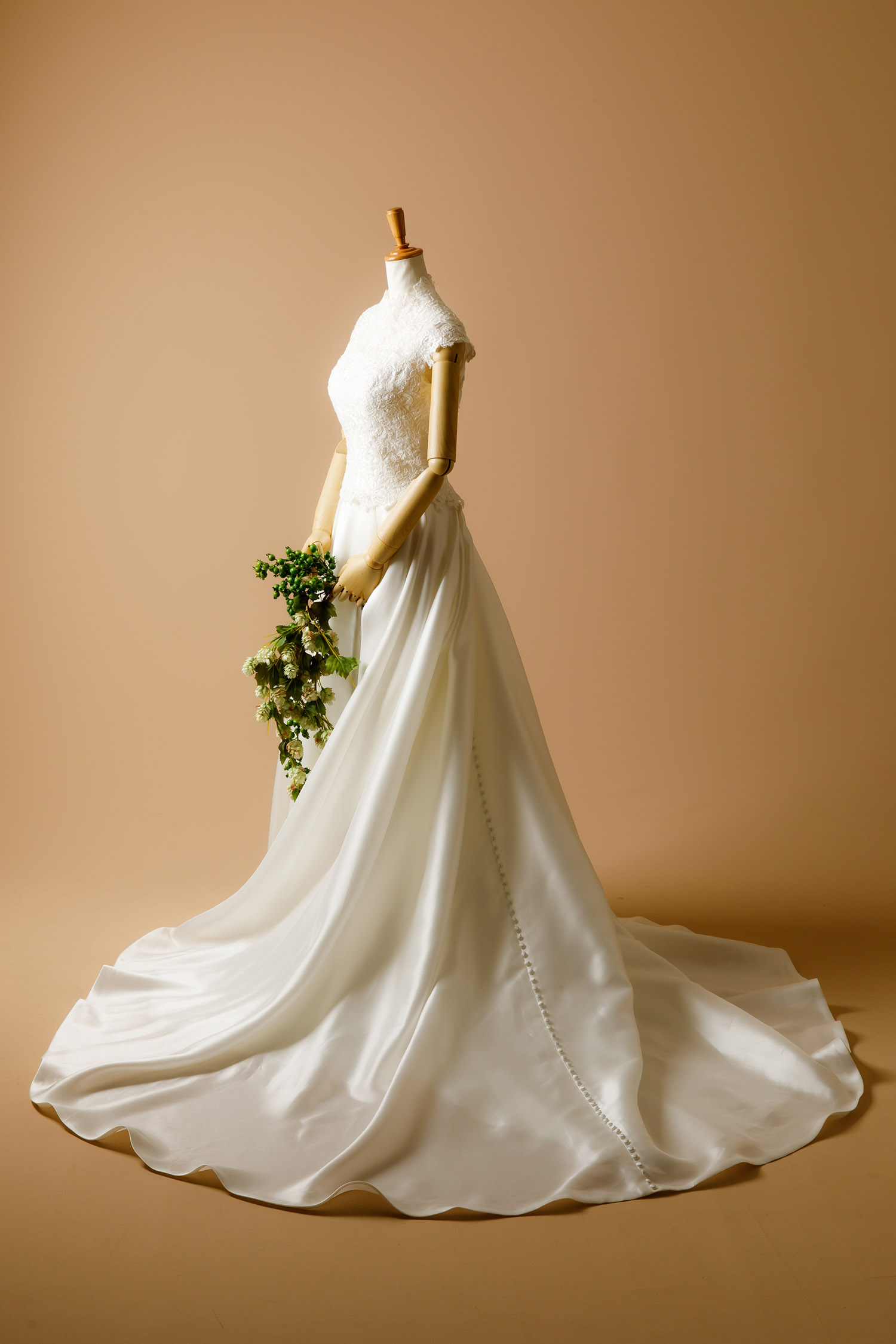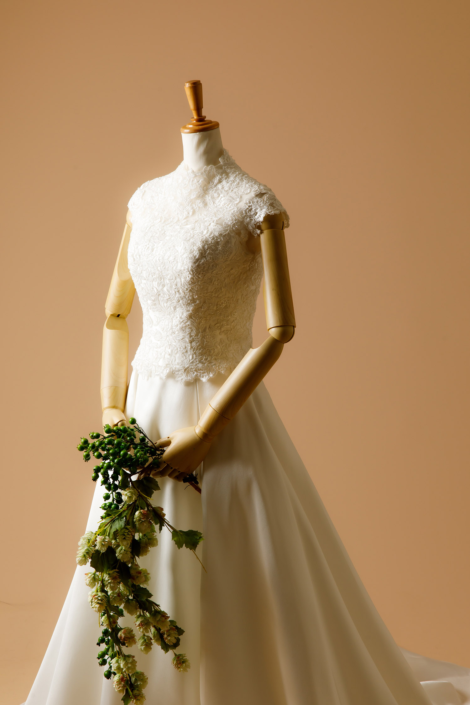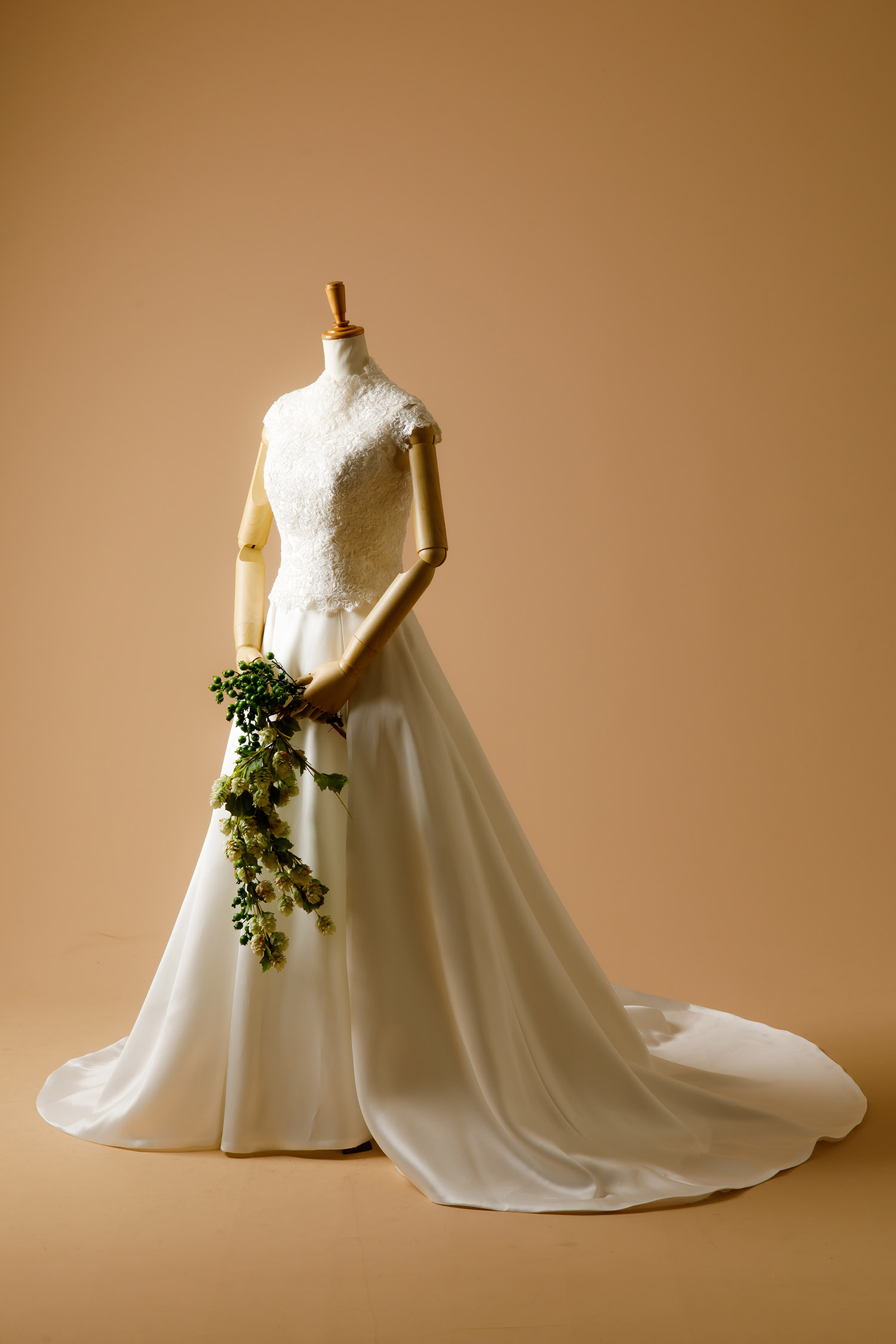 ミカド Aラインのスカートに、ビジューを施したブラウスをプラスした 2ピースのウェディングドレス 。 ブラウスだけをセミオーダー、スカートだけをセミオーダーすることも可能です。シーンに合わせて、自由自在に組み合わせてみては?