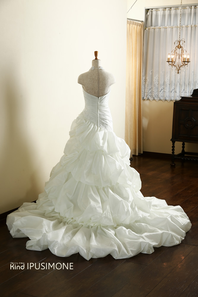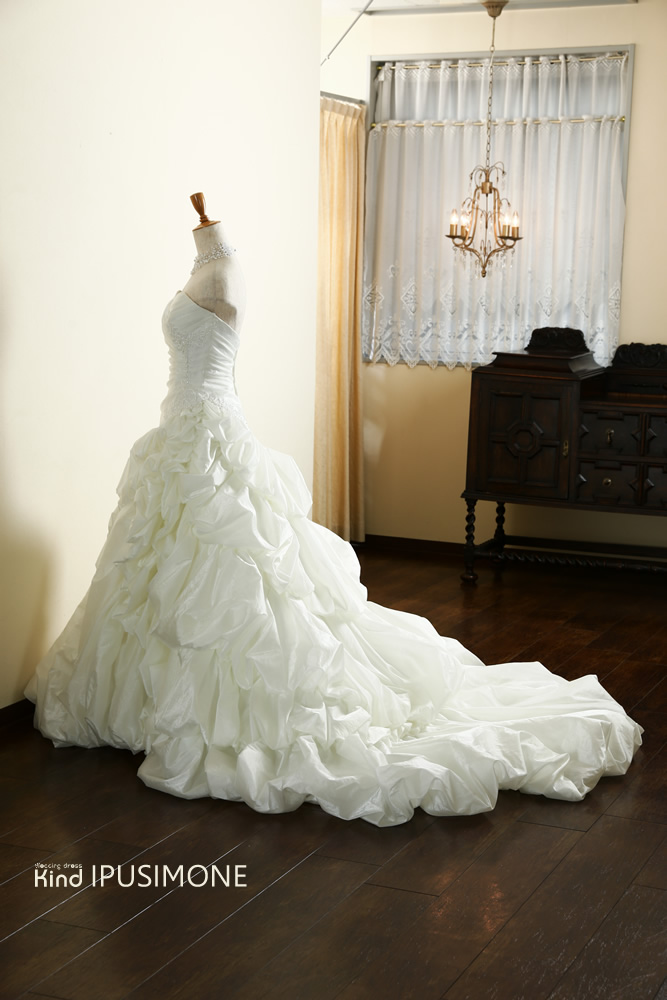 バルーンスカートに対し、ウエスト部分にカシュクールが施されているので、 よりメリハリの有るボディーに見せてくれます。動きやすくシワに なりにくい のが特徴、見た目よりも軽量のため海外ウエディングに最適。スタイリッシュで目を引くドレスです。
