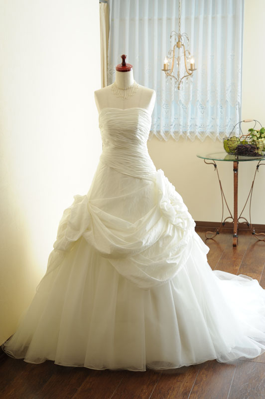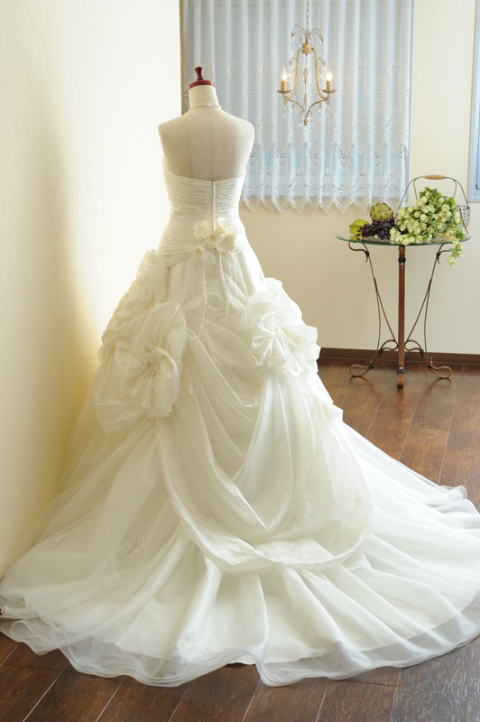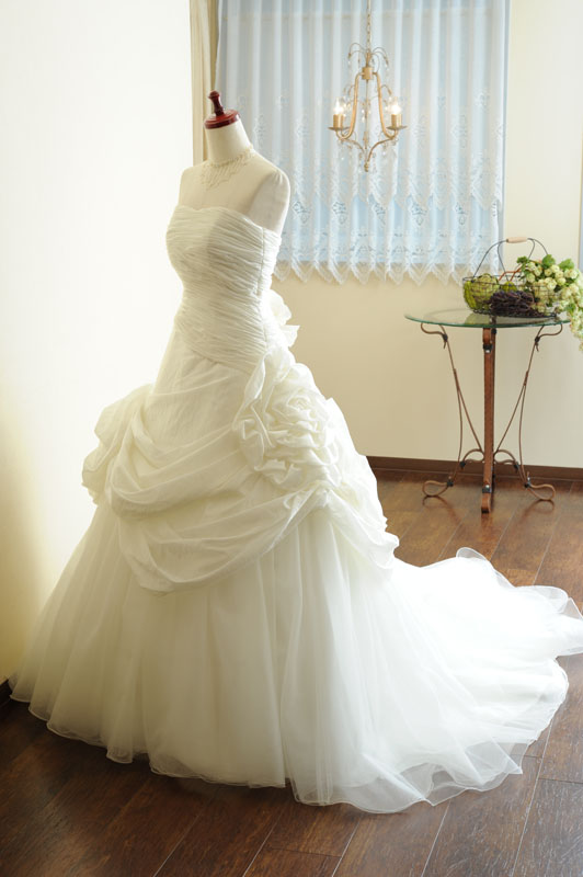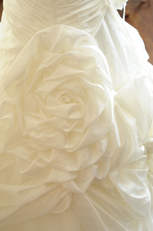 個性的なワッシャーオーガンと甘いチュールレースをミックスした華やかなプリンセスライン。左右絶妙なバランスでたくし上げたスカートには、ゲストを魅了する大輪のお花が。