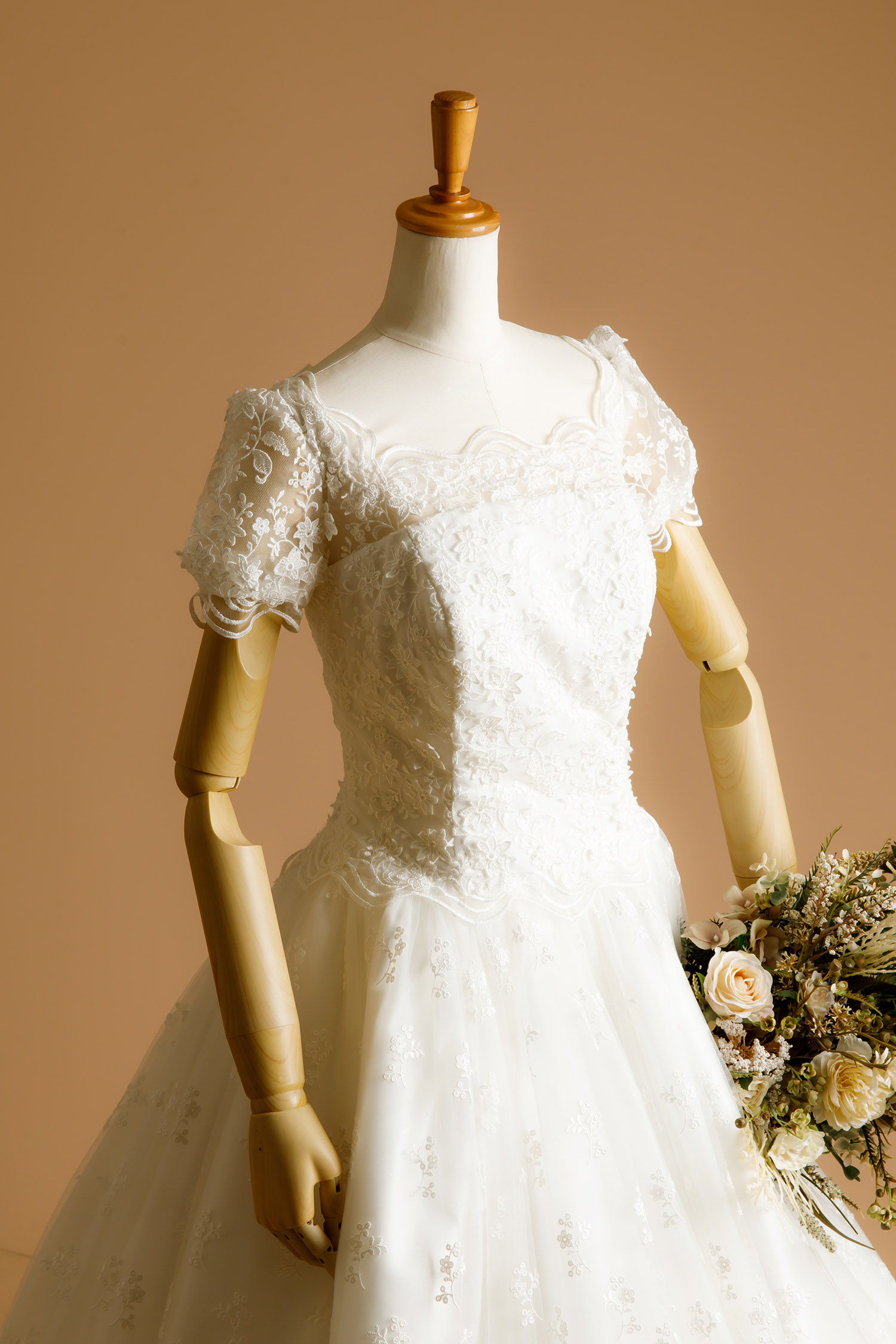 小花柄のイタリアンレースを使用した、可愛らしいプリンセスライン。大ぶりのパフスリーブ、たっぷり目の大きなスカート、透け感の有るロングトレーンが豪華。