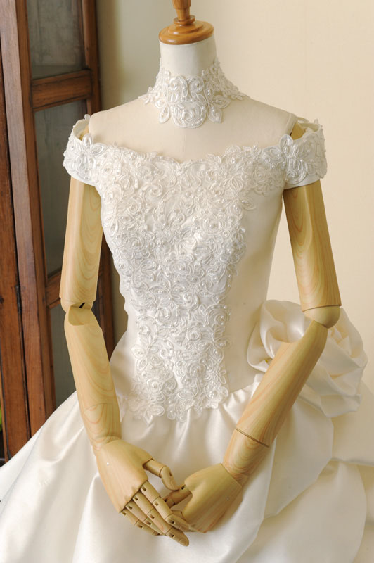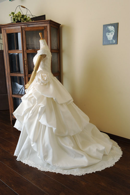 スカート部分を斜めに切り替え、大きな薔薇を中心に広がるようなタッキングを入れた大人可愛いプリンセスライン。浅めのオフショルダーとスカートラインでシンプルながら全体のスタイルが良く見えます。共レースのチョーカーも人気。