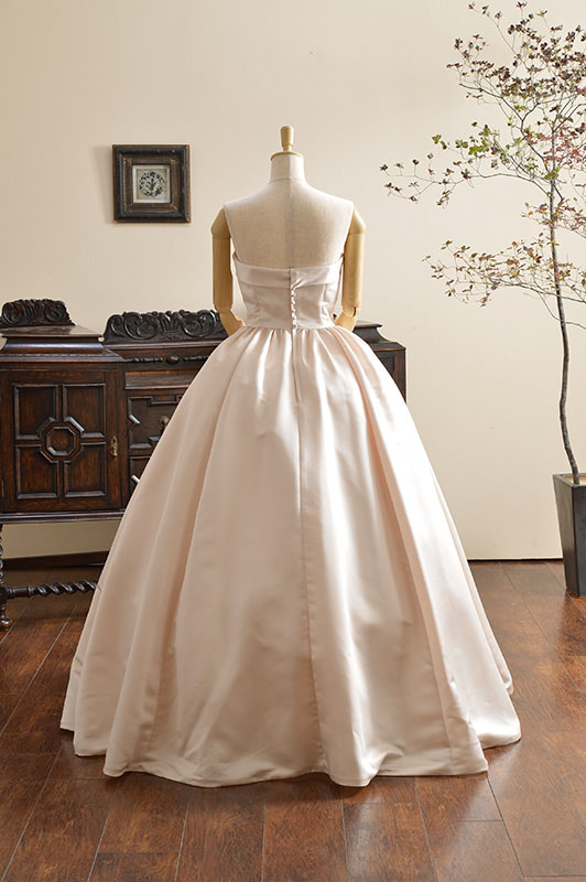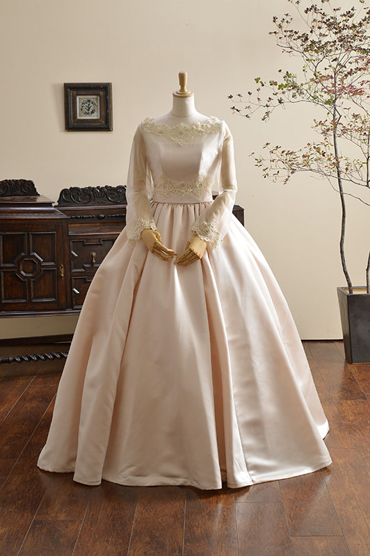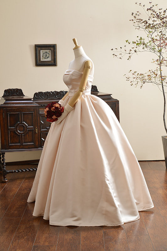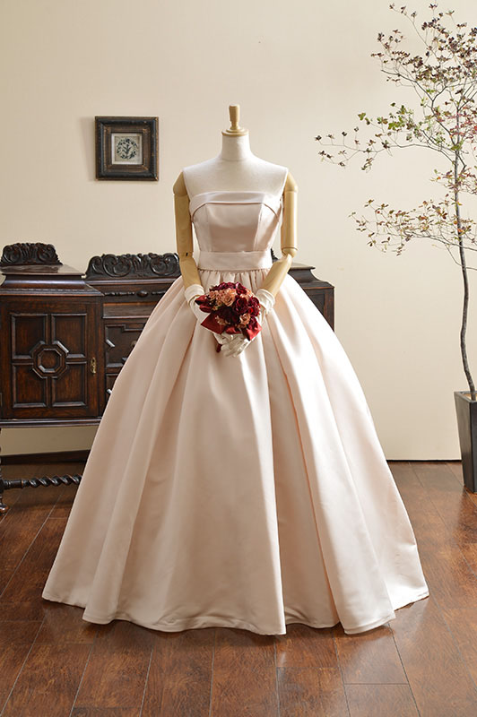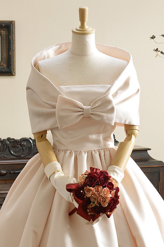 独特の張りと艶のあるイタリアサテン生地をたっぷり使用したプリンセスドレス。ボリュームラインは可愛らいクラシカルなシルエットです。リボンの着いた共布ショールは挙式もアレンジにもお召しいただけます。