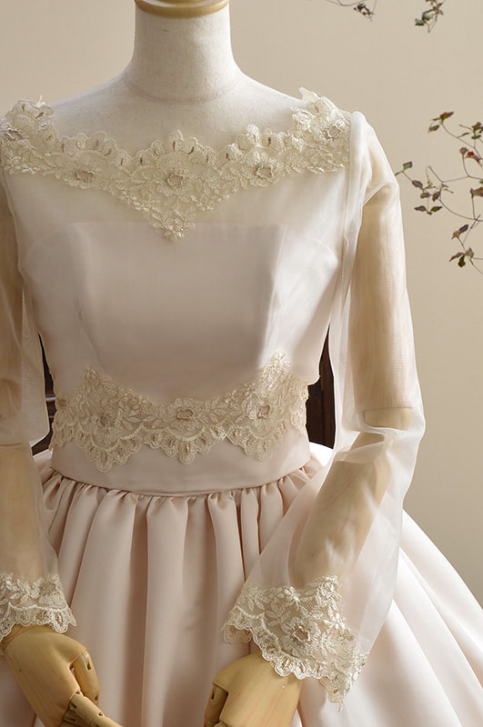 イタリアサテンの独特な風合い、トレーンまで床丈で動きやすいデザイン、 チュールにシャンパンレースをプラスしたブラウスで3WAYに。