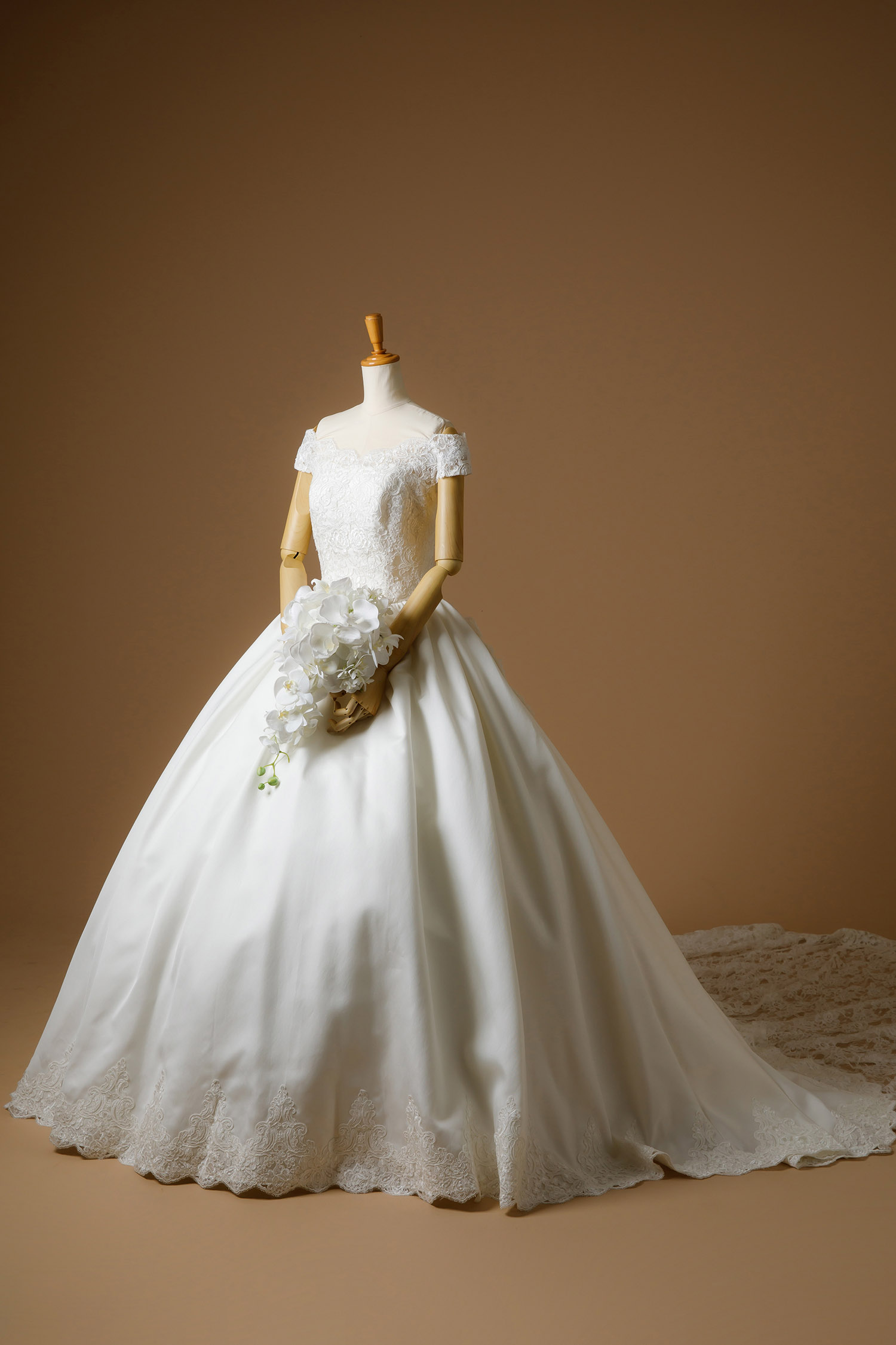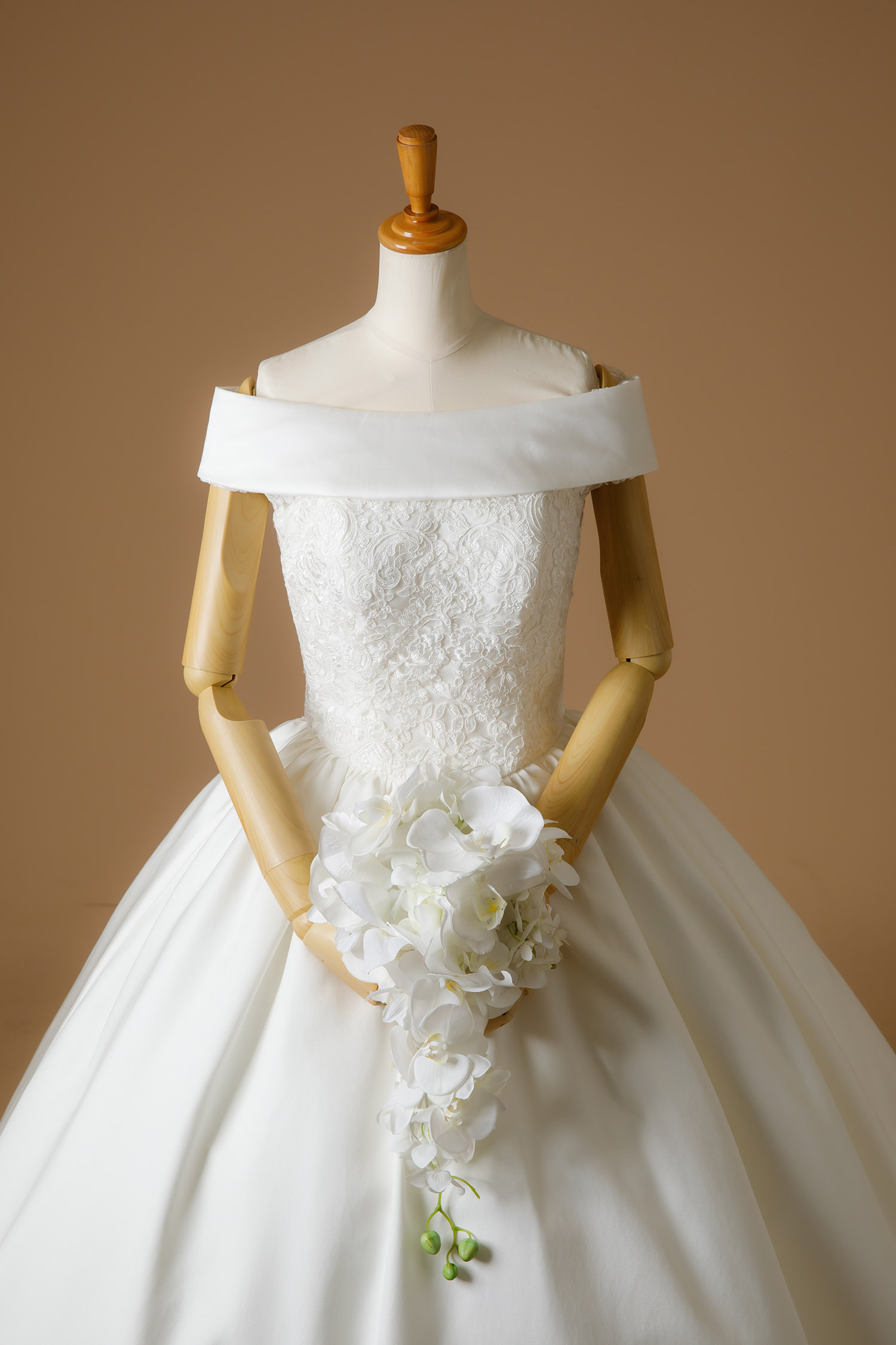 ミカド素材の生地をふんだんに使用した、ベルラインの2WAYウェディングドレスです。レースの上身頃はオフショルダーで華やかなイメージに。