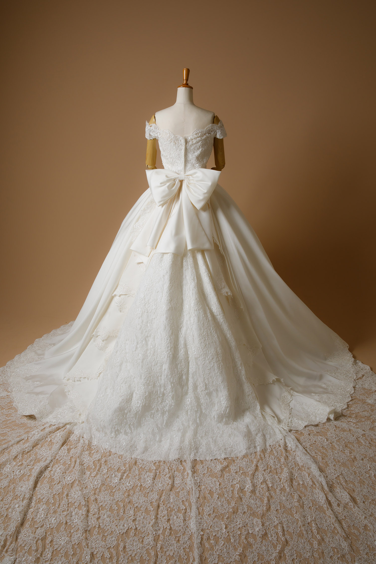 バックスタイルは、ミカドのカーテン式スカートから流れ出るようなレースロングトレーンのデザインです。